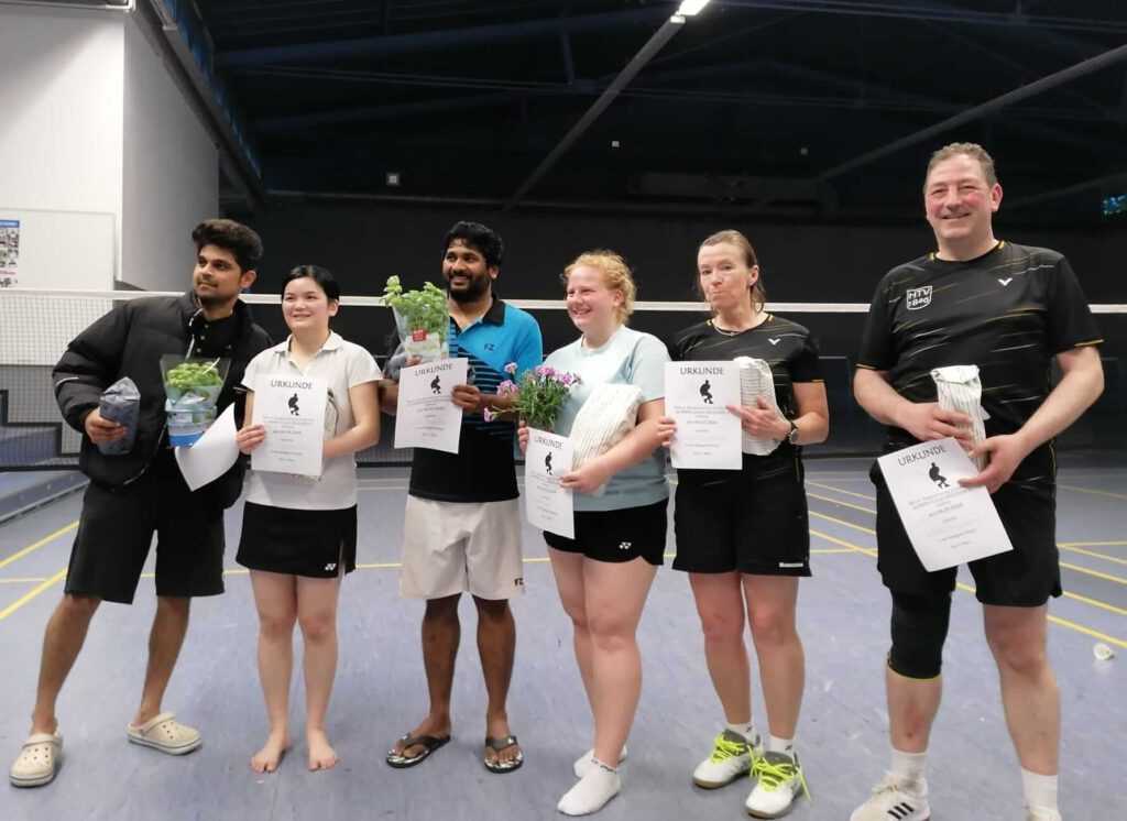 Zum Abschluss gingen noch 6 Paarungen im Mixed an den Start. Dinesh Poola und Maike Gleber (BC Spöck / TSG Weinheim) setzten sich im Finale in 3 Sätzen gegen Tejas Choudhari und Bettina Lo (SG Walldorf) durch. Das Spiel um Platz 3 gewannen Kay Schulte-Wieking und Jurate Huck (TV Heidelberg / TSG Dossenheim) gegen Min-Ho Hong und Junita Barthel (SG Walldorf).