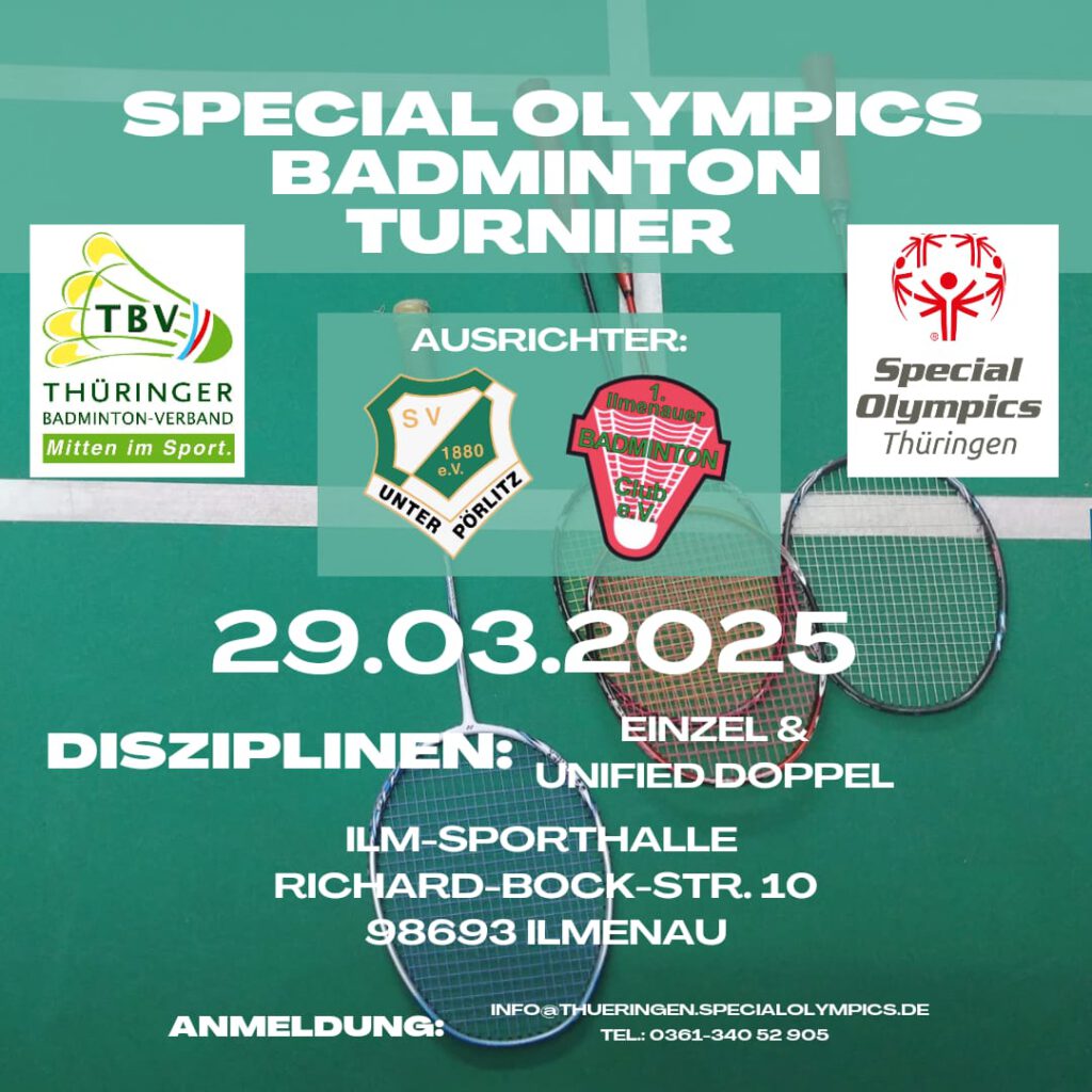 am 29.03.2025 werden wir in Thüringen erneut ein Badminton-Turnier für Menschen mit geistiger Beeinträchtigung veranstalten. Nach zwei schönen Jahren in Jena möchten wir nun neue Landschaften im grünen Herzen Deutschlands erkunden. Dieses Mal treffen wir uns im wunderschönen Südthüringen, genauer gesagt in Ilmenau. Ausrichter sind der Ilmenauer Badminton Club e.V. und der SV 1880 Unterpörlitz e.V.