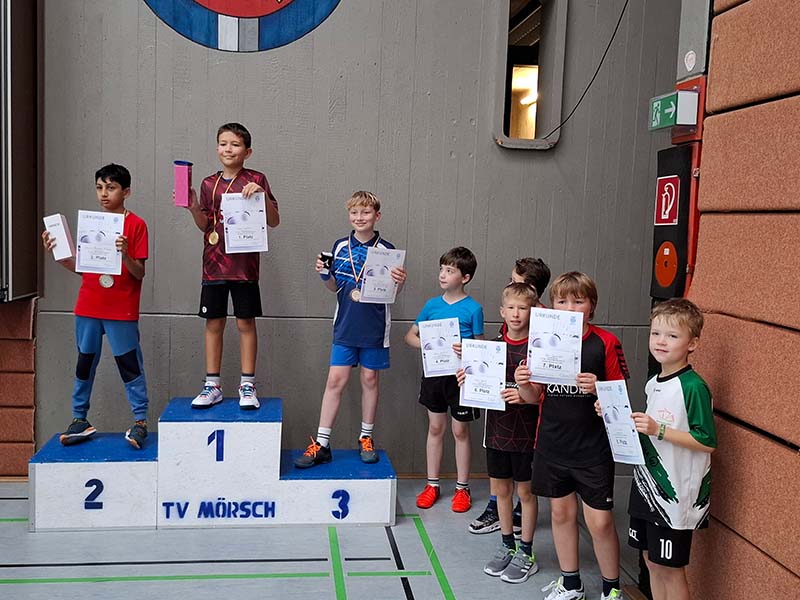 Der TV Mörsch 1900 e.V. schätzte sich sehr glücklich 110 Kinder und Jugendliche zum 5. E-RLT 2024 Nordbaden in der Keltenhalle begrüßen zu dürfen. 21 Vereine waren dabei und hatten teilweise lange Anfahrten in Kauf genommen. Vielen Dank dafür! Am stärksten waren die BSpfr. Neusatz (16 TN), der BV Rastatt (13 TN), der TV Mörsch (12 TN) und die TSG Heilbronn (11) TN vertreten. Dank der umsichtigen Turnierleitung wurden die insgesamt 226 Spiele zügig auf die 11 Spielfelder verteilt. Außerdem hatten Martin Rupp und Marcel Schoolmeesters im Vorfeld die Sätze bei den Altersklassen U11 bis U15 auf 15 anstatt 21 Punkte begrenzt und den Treffpunkt für die AK U15 bis U19 auf 13.30 Uhr gesetzt. Bis die älteren in die Halle kamen, hatten die U11/U13 zwei bis drei Runden hinter sich! Betrachtet man die Aufteilung der TN nach Altersklassen, fällt auf, dass zumindest bei den Jungen, die AK´s U11 bis U15 sehr gut besetzt waren, die U17 und 19 dafür eher dürftig. Wie in den Jahren zuvor liegt das zahlenmäßige Verhältnis Jungen /Mädchen bei etwa 3:1. In den verschiedenen AK`s sah es so aus: U11: 24/6, U13: 24/9, U15: 23/4, U17: 8/7, U19: 4/1.Nur Lucija Dujic hatte sich für das ME U19 gemeldet. Sie spielte bei den U17 mit, wurde dann als Siegerin des U19 gekürt. Es müssten sonst keine weiteren Altersklassen zusammengelegt werden.